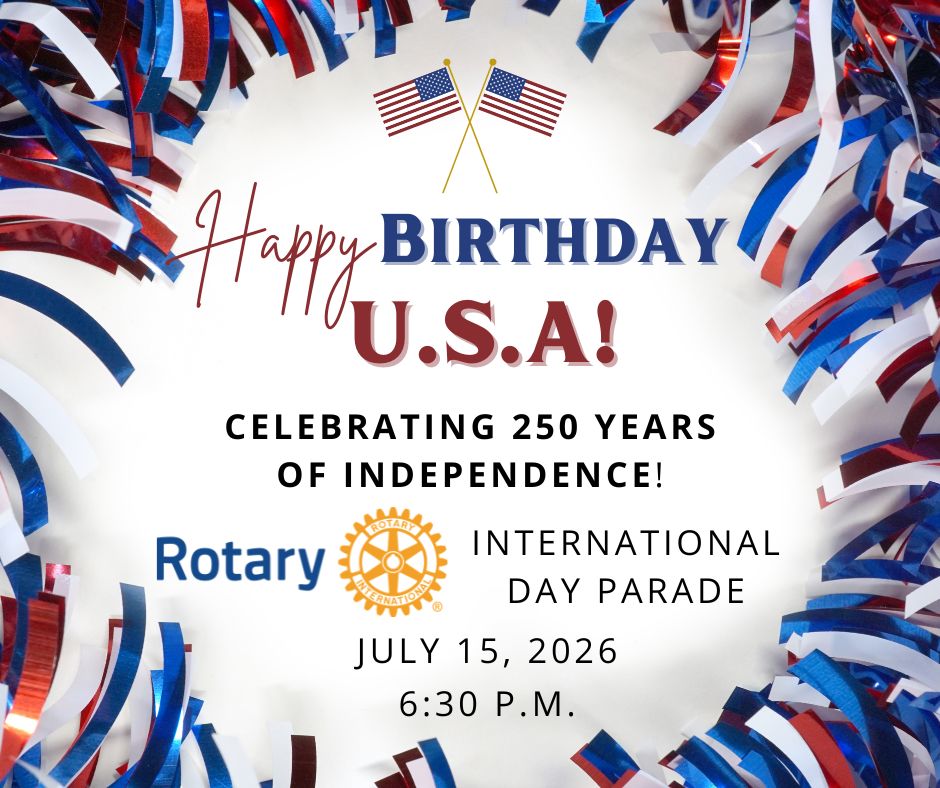 The theme for this year’s parade is “Happy Birthday U.S.A.!”. Rotary would like to celebrate the 250th signing of the Declaration of Independence with a red, white and blue color palette and patriotic theme.